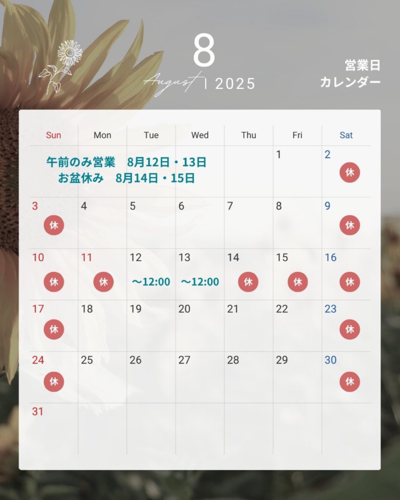 8月の営業日です、よろしくお願い致します。